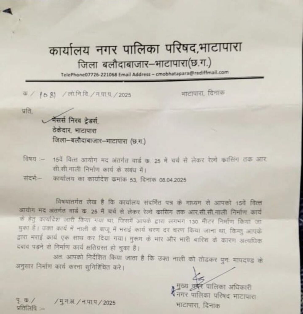 भाटापारा : – सूत्रों से जानकारी अनुसार 15 वें वित्त आयोग मद अंतर्गत नगर के वार्ड क्रमांक 25 सेंट मैरी स्कूल के सामने में चर्च से लेकर रेलवे क्रासिंग तक लाखों रुपया का लगभग 130 मीटर आरसीसी नाली निर्माण कार्य किया जा रहा है ।उक्त कार्य में नाली के बाजू में भराई कार्य चरण दर चरण किया जाना था , किंतु मेसर्स निरव ट्रेडर्स ठेकेदार द्वारा भराई कार्य एक साथ कर दिया गया । मुरम के भार और बारिश के कारण अत्यधिक दबाव पड़ने से निर्माण कार्य पूर्ण रूप से क्षतिग्रस्त हो गया । जिस से ठेकेदार द्वारा घोर लापरवाही उजागर हो रही है ।उक्त निर्माण कार्य में घोर लापरवाही बढ़ते जाने के कारण नगर पालिका परिषद भाटापारा द्वारा मेसर्स नीरव ट्रेडर्स ठेकेदार भाटापारा को नोटिस भी जारी कर दिया गया है । एवं उक्त निर्माण को पुनः करवाने हेतु निर्देशित किया है ।जैसा कि ज्ञात रहे हमारे संवाददाता द्वारा कुछ महीने पूर्व नई दुनिया में खबर प्रकाशित किया गया था कि नहर किनारे बन रहे नाली निर्माण के कारण बिजली विभाग द्वारा लगाए गए पोल ( खम्बे ) भी इससे प्रभावित हो कर गिर चुके हैं । जिसे नगर पालिका अध्यक्ष अश्वनी शर्मा द्वारा संज्ञान में लेते हुए इस पर त्वरित कार्यवाही करते हुए कार्य को मजबूती से करने हेतु ठेकेदार एवं नगर पालिका अधिकारी को को आदेश दिया था । इसके बावजूद ठेकेदार और नगर पालिका परिषद की कार्य पद्धति पर घोर लापरवाही उजागर हो रही है , यदि समय रहते उक्त ठेकेदार और अधिकारियों पर उचित कार्यवाही नहीं की जाती है तो किसी भी बड़े दुर्घटना की आशंका को नकारा नहीं जा सकता ।