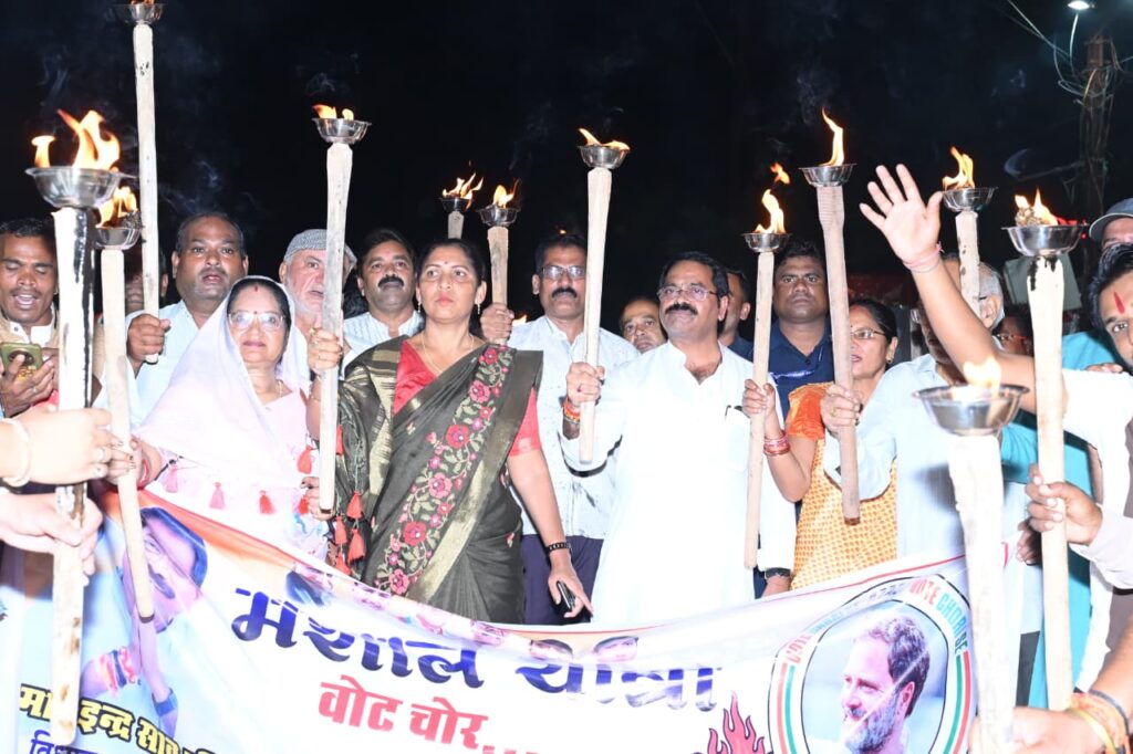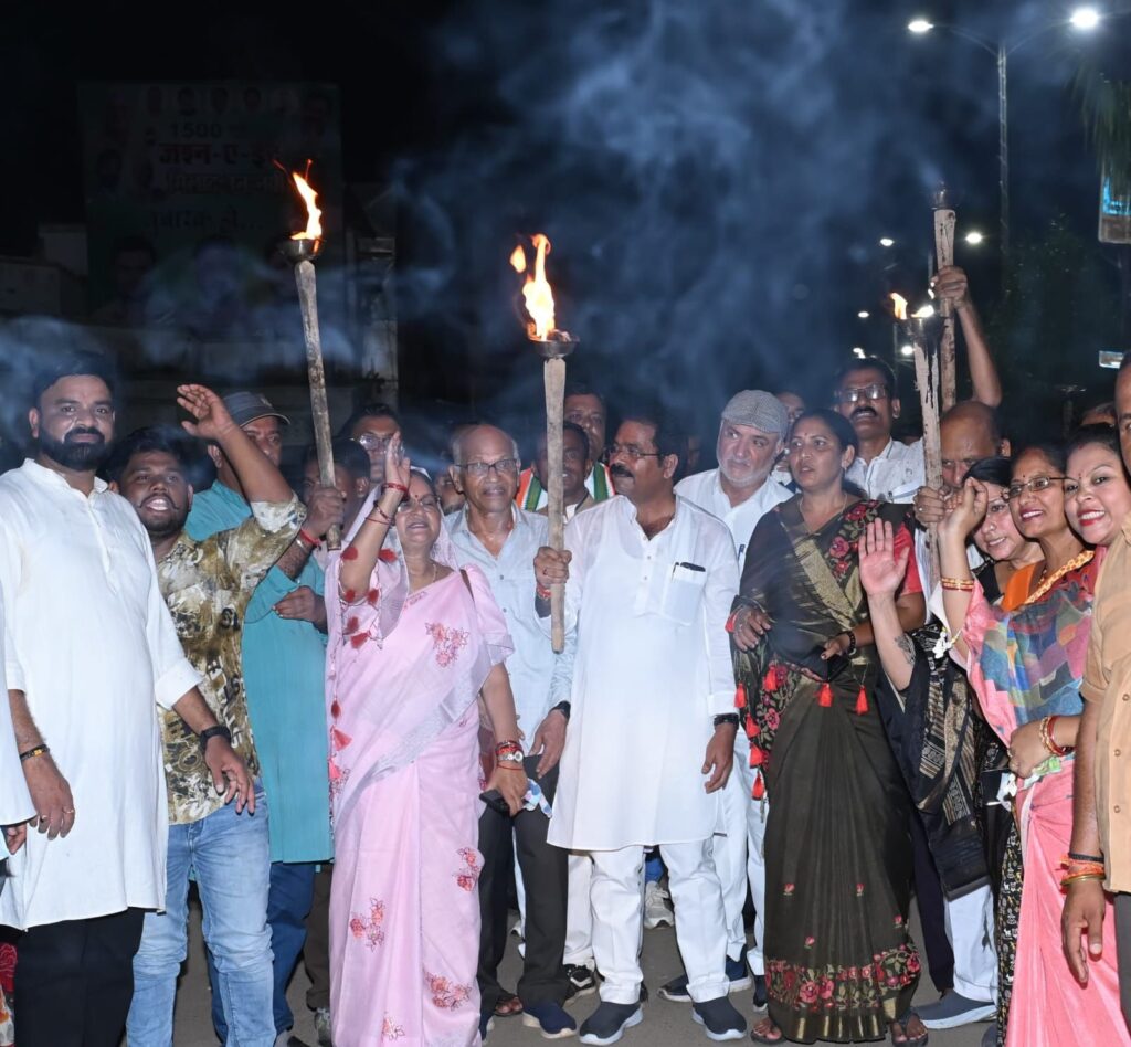 विधायक श्री साव ने कहा कि वोट की चोरी प्रजातांत्रिक देश में लोकतंत्र की ताकत को कमजोर करने का काम भाजपा कर रही है और चुनाव आयोग भी कुछ नहीं कर पा रहा है। प्रदेश सरकार को आड़े हाथ लेते हुए विधायक श्री साव ने कहा कि जगह जगह अवैध शराब बिक्री और बिजली बिल हाफ योजना को बंद कर जनता को परेशान करने का काम प्रदेश सरकार कर रही है,आज हुआ यह मार्च जनता की आवाज़ और संघर्ष का प्रतीक है। इसके पूर्व युवक कांग्रेस के नेतृत्व में नगर के दानवीर भामाशाह चौक से मशाल रेली निकाली गई जो कि महतारी चौक होते हुए महात्मा गांधी चौक मे सरकार का पुतला दहन किया गया। इस मशाल रैली में मुख्य रूप से जिलाध्यक्ष सुश्री सुमिंत्रा घृतलहरे, ईश्वर सिंह ठाकुर, राजकुमार शर्मा, आलोक मिश्रा, रोशन हबलानी, दिवाकर मिश्रा, अजित बाजपेयी, अमर मंडावी, अरुण यदु,चंद्रशेखर चक्रधारी,अजय ठाकुर,गेंद राम साहू, नानू सोनी, सीरीज जांगड़े,नितिन शुक्ला,मोहन निषाद, मनमोहन कुर्रे, गौरी भृगु, प्रमिला साहू, पूर्णिमा श्रीवास, लक्ष्मी पांडेय, दानी भाट, बिमलेश्वरी ध्रुव,दीपक वर्मा,संतोष सोनी, विक्की ठाकुर,मुकेश साहू,नवीन बक्स, सुरेंद्र यदु, अय्यूब खान,जीत्तू शर्मा, मनहरण वर्मा,राजा वर्मा, ओमप्रकाश यदु,मुकेश हेंवार,रविशंकर ध्रुव, सतवंत बंजारे, राजा तिवारी,मनमोहन कुर्रे,सत्यजीत शेन्डे,आदिल चनिजा, कौशल साहू,आकिब मेमन,हरीश लहरे,अमित मार्कण्डेय,विजय महिलांगे,सद्दाम खान,शशांक चौबे,मुकेश यदु,किरत वर्मा,पुनु मानिकपुरी प्रमोद पाल आदि बड़ी संख्या में युवा कांग्रेस साथी गण उपस्थित रहे।।