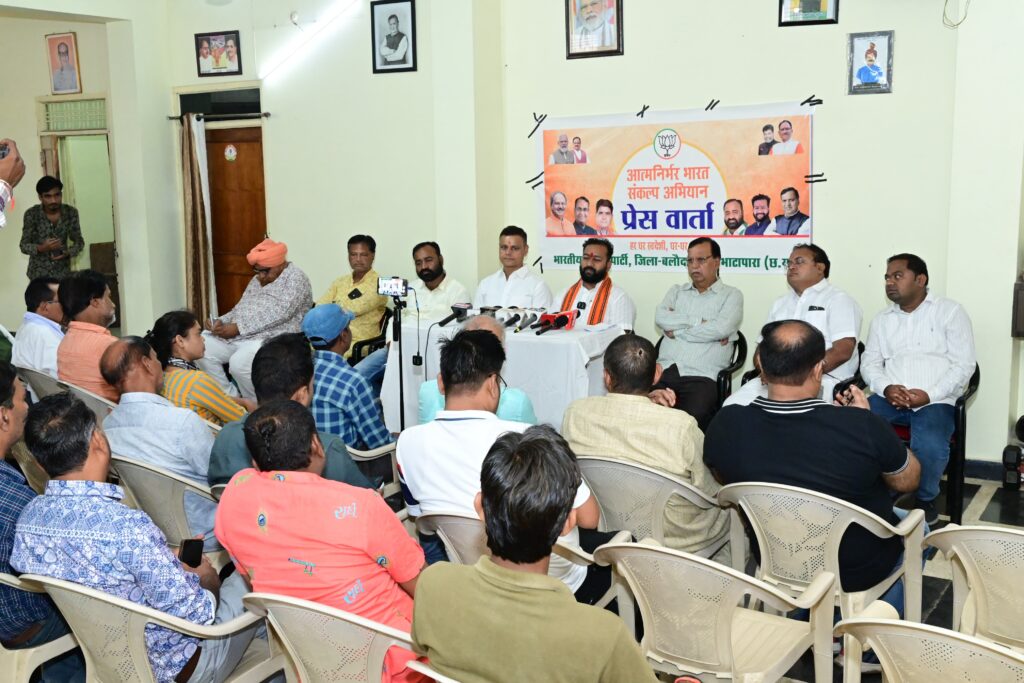 भाटापारा:- भाजपा कार्यालय में आत्मनिर्भर भारत अभियान पर केंद्रित प्रेस वार्ता रखी गई। इस दौरान प्रदेश भाजपा मंत्री अमित साहू, वरिष्ठ भाजपा नेता शिवरतन शर्मा, जिलाध्यक्ष आनंद यादव शामिल हुए। कहा कि, आत्मनिर्भर भारत संकल्प अभियान 25 सितंबर (पं. दीनदयाल उपाध्याय जी की जयंती) से प्रारंभ होकर 25 दिसंबर (भारत रत्न अटल बिहारी वाजपेयी जी की जयंती) तक संचालित किया जा रहा है। इस अभियान का उद्देश्य ‘हर घर स्वदेशी, घर-घर स्वदेशी’ की भावना को जन-जन तक पहुँचाना है।