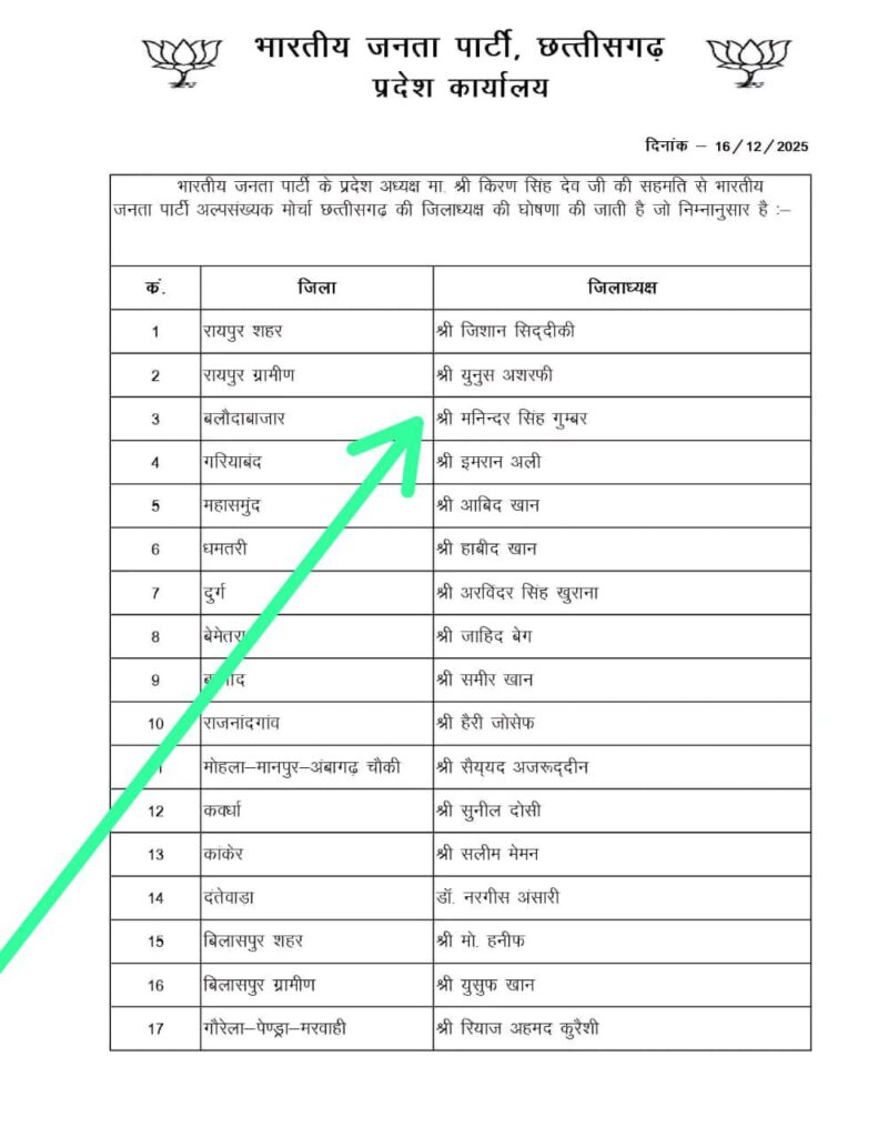 भाटापारा–भारतीय जनता पार्टी के प्रदेश अध्यक्ष किरण सिंह देव कि सहमति से भारतीय जनता पार्टी अल्पसंख्यक मोर्चा छत्तीसगढ़ जिला अध्यक्ष की घोषणा की गई जिसमें बलौदा बाजार भाटापारा से जिला अध्यक्ष मनिंदर गुंबर सोनी को प्रभार मिला।