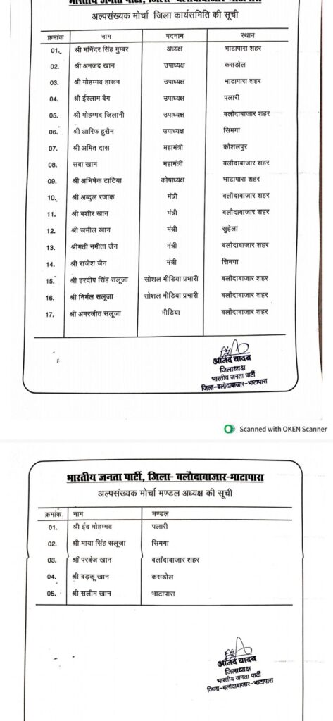 भाटापारा | भाजपा अल्पसंख्यक मोर्चा जिलाध्यक्ष मनिंदर सिंह ने अपनी कार्यकारिणी —- गौरी शंकर अग्रवाल ,,शिव रतन शर्मा,,मंत्री टंकराम वर्मा एवं जिला अध्यक्ष आनंद यादव और भाजपा के वरिष्ठ जनों की सहमति से जिला कार्यकारिणी की घोषणा की है। जिसमें 16 लोगों को शामिल किया गया है। इसमें अधिकांश वो चेहरे हैं ,जो पहले मंडल और मोर्चा संगठनों में काम कर चुके हैं।